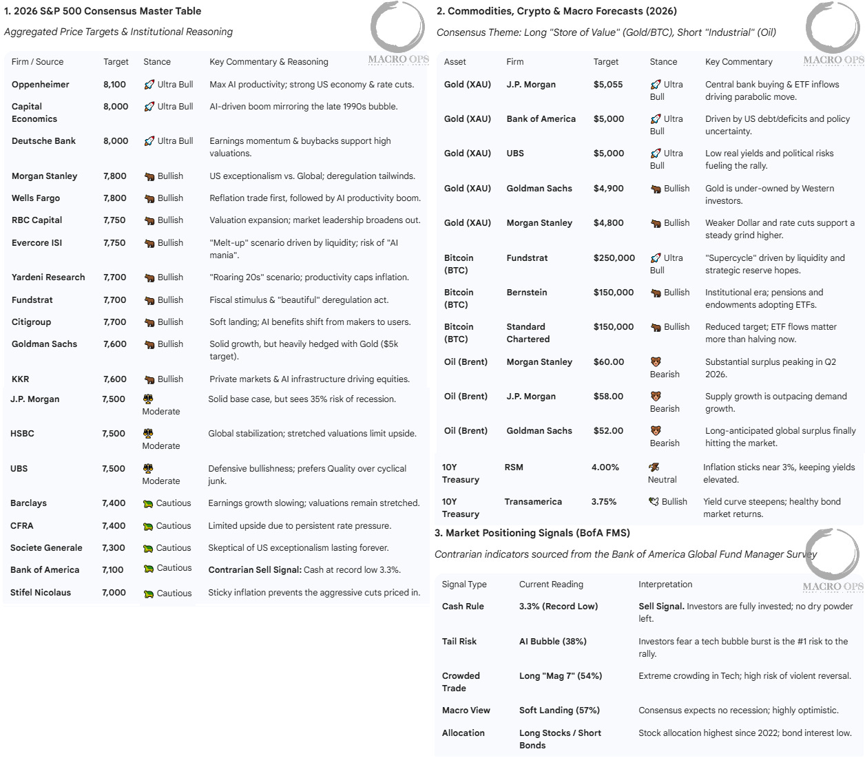 6. Here’s the 2026 market outlook and price targets for SPX, gold, oil, and BTCUSD. Some thoughts… All the shops are bullish equities (though most are projecting pretty modest gains). There’s a stubborn bullish consensus on BTC despite its poor performance in 25’. And oil is still getting no love.