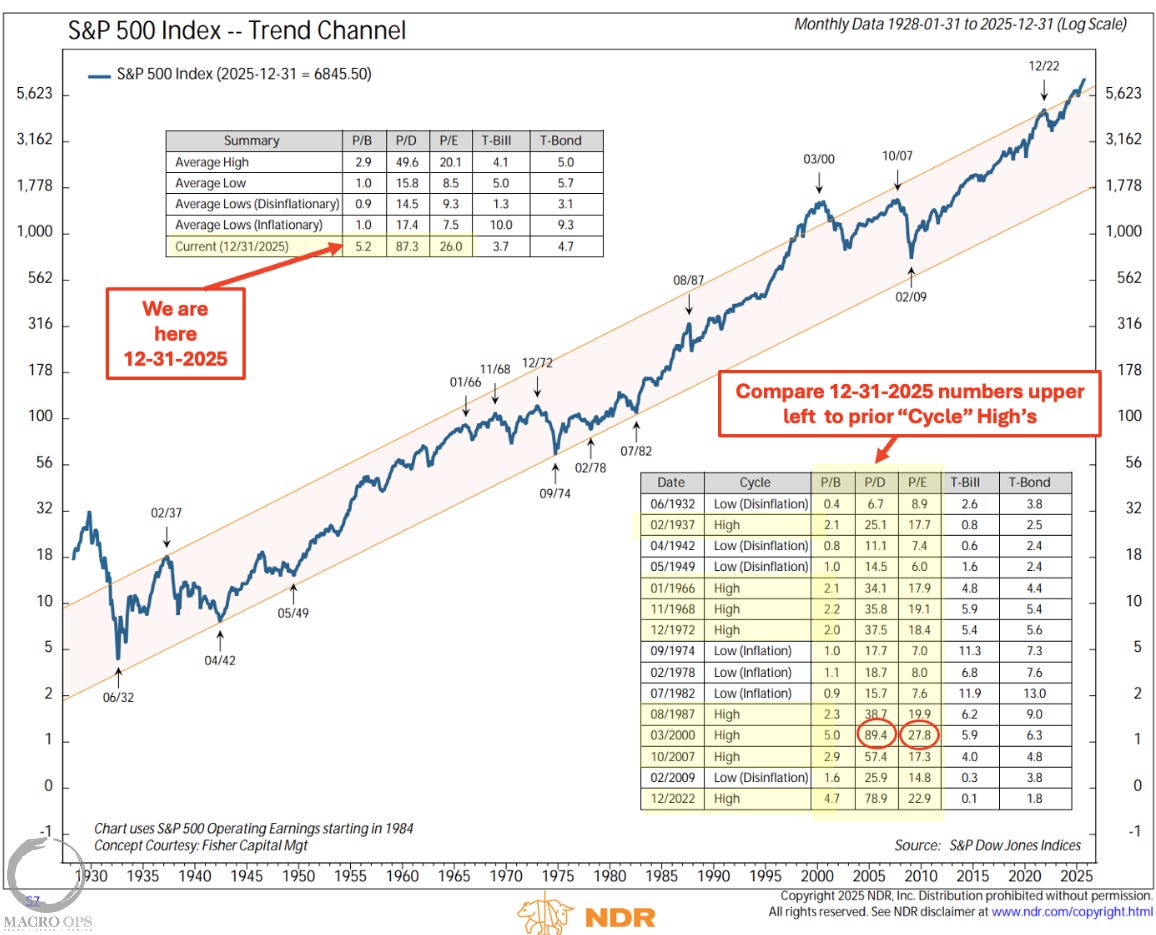 2. Record-high equity holdings go hand in hand with record-high valuations. Neither are timing tools, as each condition can persist for some time. But over a sufficiently long time horizon, valuations are the predominant driver of returns. As we head into 2026, both of these will increasingly become headwinds (NDR chart via CMG).