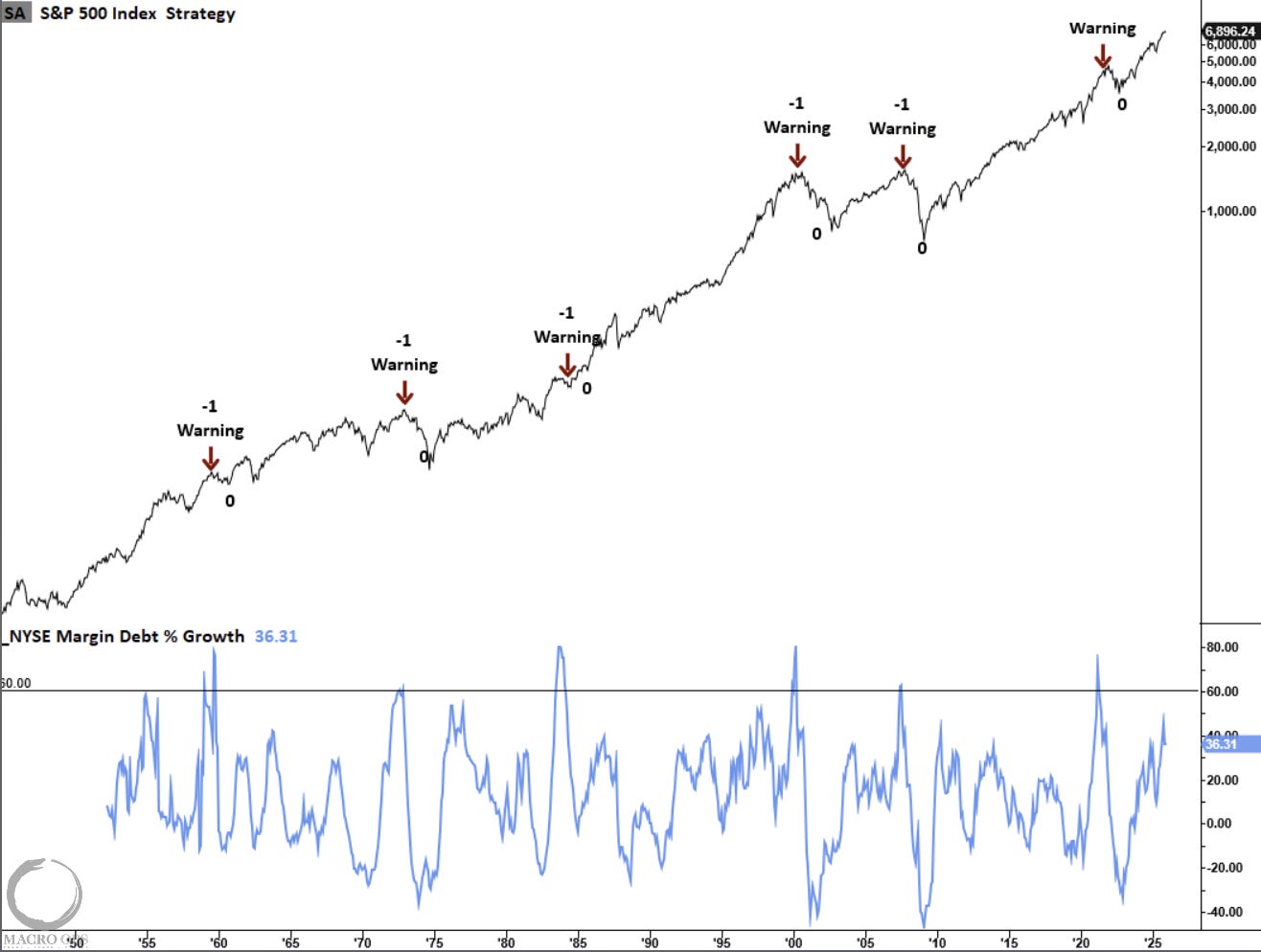 4. One of the key Risk Cycle indicators we track is the RoC in NYSE FINRA Margin Debt. Cyclical bear markets occur when investors get out over their skis, as built-up leverage is required to induce the forced selling which undergirds a grinding bear market. A conditional risk signal triggers when margin debt rises above 60% on a YoY basis. We’re currently at 37%, which is elevated but still well below the threshold (chart via our friend Dean over at TPMR).
