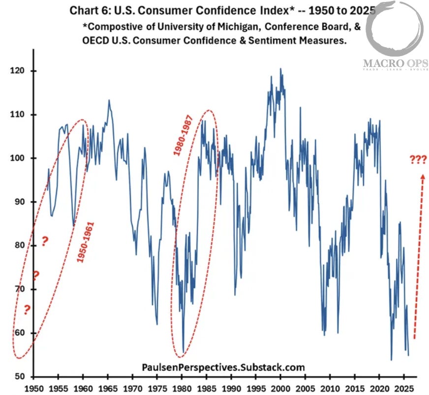 7. Jim Paulsen made the argument in a recent post (link here) that consumer confidence is as critical to stock market success as earnings, despite receiving far less attention. He highlights the current massive divergence between the two and draws parallels to the 1950s and 1980s, when stocks soared primarily on rising optimism. Consequently, Jim views a rebound in Main Street confidence as the likely “winning ticket” for 2026, positioning the S&P 500 for solid returns even if earnings growth remains flat.
