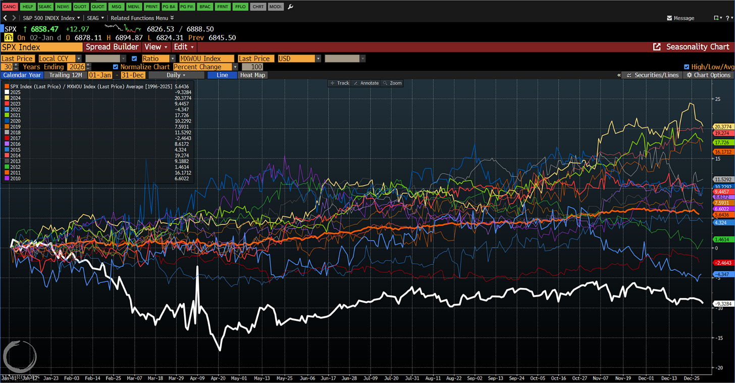 3. In 2025, the SPX saw its worst performance relative to the MSCI World ex-US index in over 15 years (white line). Was this a change in cyclical leadership or a temporary wobble? We’ll have to see if this trend persists, as it’ll have significant implications for the dollar and commodities, if so.