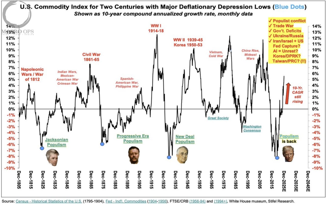 11. This great chart from Stifel Research shows the 10-year annualized growth rate for the commodities index and how major deflationary lows drive the election of populist politicians, which then leads to wars, which drive the tops in commodity super cycles. This is an interesting view of the Narrative Pendulum in action.