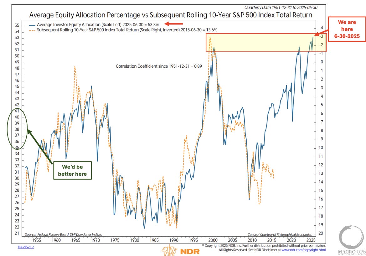 Household allocation to equities as a percentage of financial assets is at an all-time high (blue line). Historically, this is bad juju for the subsequent rolling 10-year returns (orange line) (NDR chart via CMG).