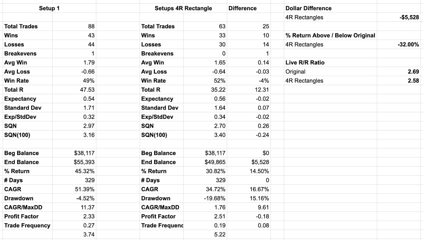 One important note before we dive in, I track both total trades and exclusively rectangle trades. This allows me to see how well a rectangle-only system performs compared to trading all available patterns.