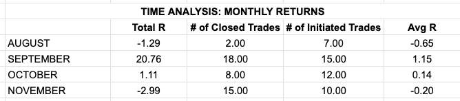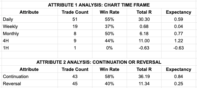 Daily charts remain the highest win-rate time frame at 55%, and since I’ve taken 51 trades off that time frame, it’s generated the highest Total R at 30.30.