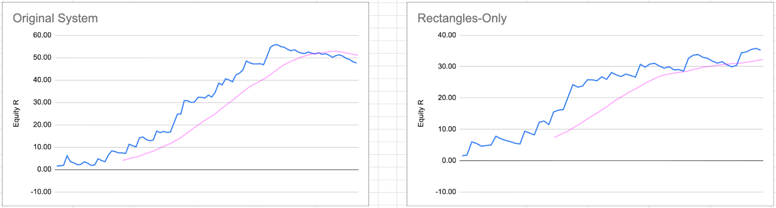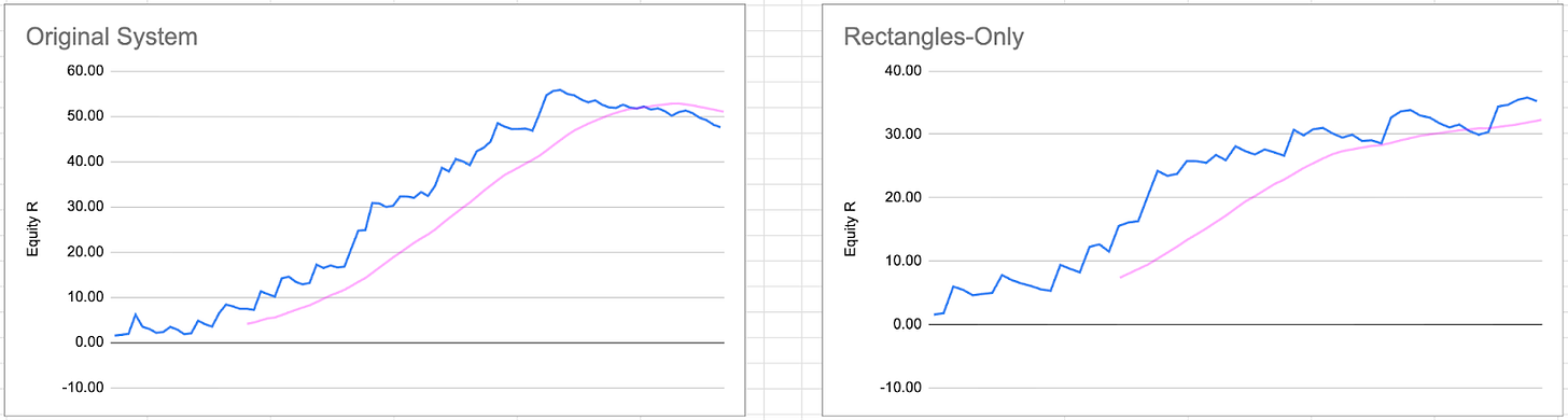 My real-time “R/R ratio” is 2.69x for my original system and 2.58x for the rectangles-only system. In other words, on average, my wins are 2.69x the size of my losses.
