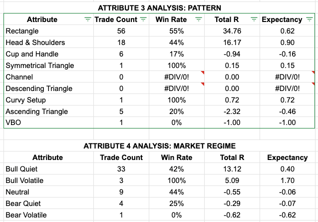 Bear Market Regimes are hard: I’m adding Market Regime data to my 2025 trade log, but I only have it from June onwards. Since that time, I’ve lost money trading bear market regimes (-0.29R Bear Quiet and -0.62R Bear Volatile). It will be interesting to see what the full-year data shows once complete.
